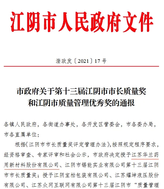 公司榮獲第十三屆“江陰市市長質(zhì)量獎(jiǎng)”。2021年開始的“十四五”時(shí)期,形成以國內(nèi)大循環(huán)為主體、國內(nèi)國際雙循環(huán)相互促進(jìn)的新發(fā)展格局。華蘭把握國家“十四五”時(shí)期新發(fā)展階段的新機(jī)遇和新挑戰(zhàn),始終把華蘭制造向華蘭創(chuàng)造轉(zhuǎn)變、把華蘭速度向華蘭質(zhì)量轉(zhuǎn)變、把華蘭產(chǎn)品向華蘭品牌轉(zhuǎn)變”。堅(jiān)持精耕實(shí)做,強(qiáng)化創(chuàng)新、管理、融合、投資、責(zé)任意識(shí),為開啟華蘭打造世界領(lǐng)先企業(yè)的新篇章加油!